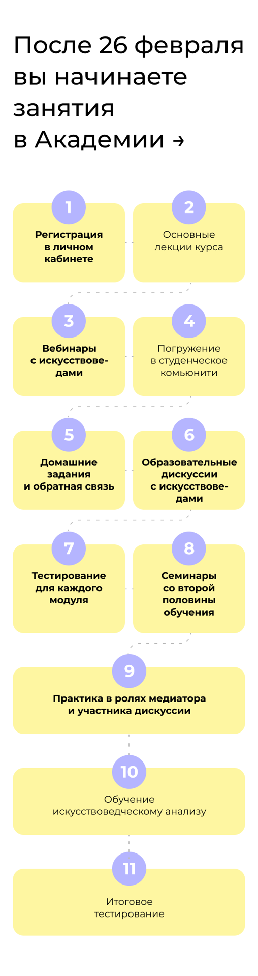 → 8+ мероприятий ежемесячно: арт-бранчи, экскурсии, визиты в ведущие галереи и мастерские современных художников, посещение вернисажей, ярмарок и закрытых открытий, лекции от ведущих практиков арт-рынка и коллекционеров.