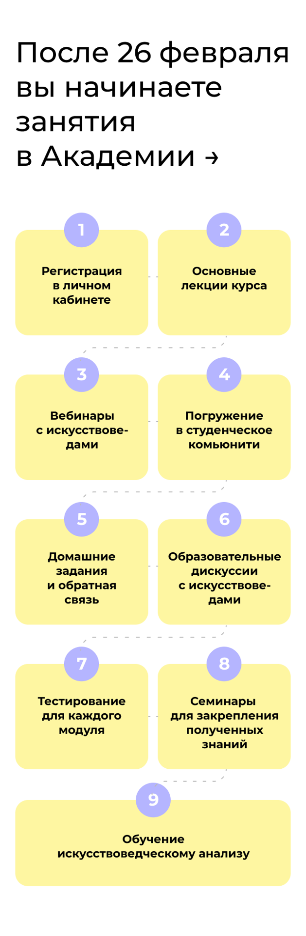 Все обучение проходит онлайн. Вы можете смотреть лекции, когда вам удобно. Что касается онлайн-вебинаров, если у вас не получится попасть на них, вы можете посмотреть их в записи. А на все ваши вопросы или комментарии искусствовед отвечает на площадке. По опыту прошлых потоков, студенты из самых разных часовых поясов чувствуют себя комфортно и подбирают оптимальное время для учебы.