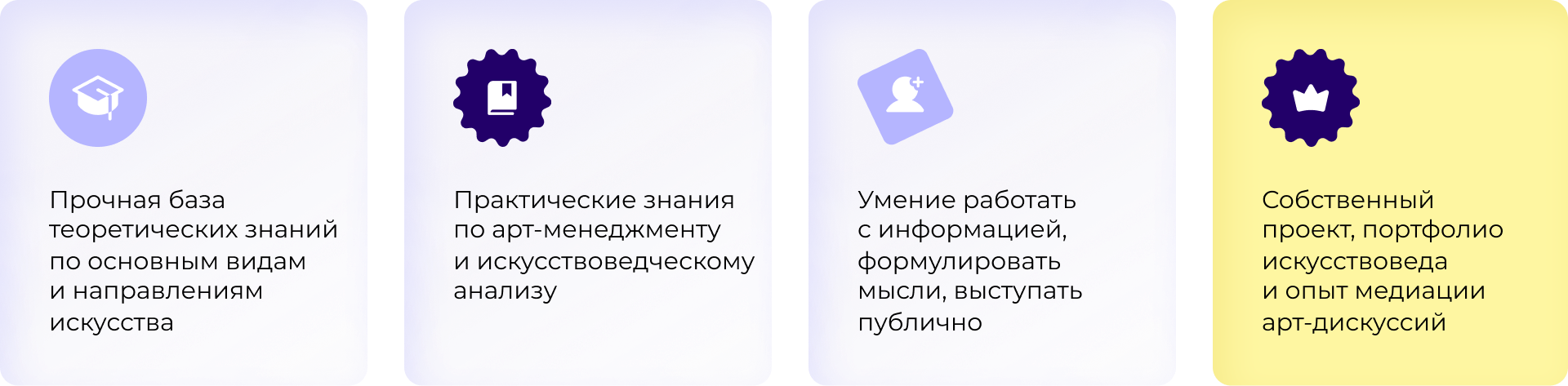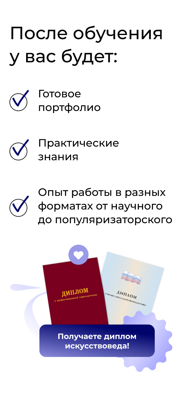Вы сформируете собственное резюме искусствоведа, включающее статьи, доклады, планы арт-проектов.