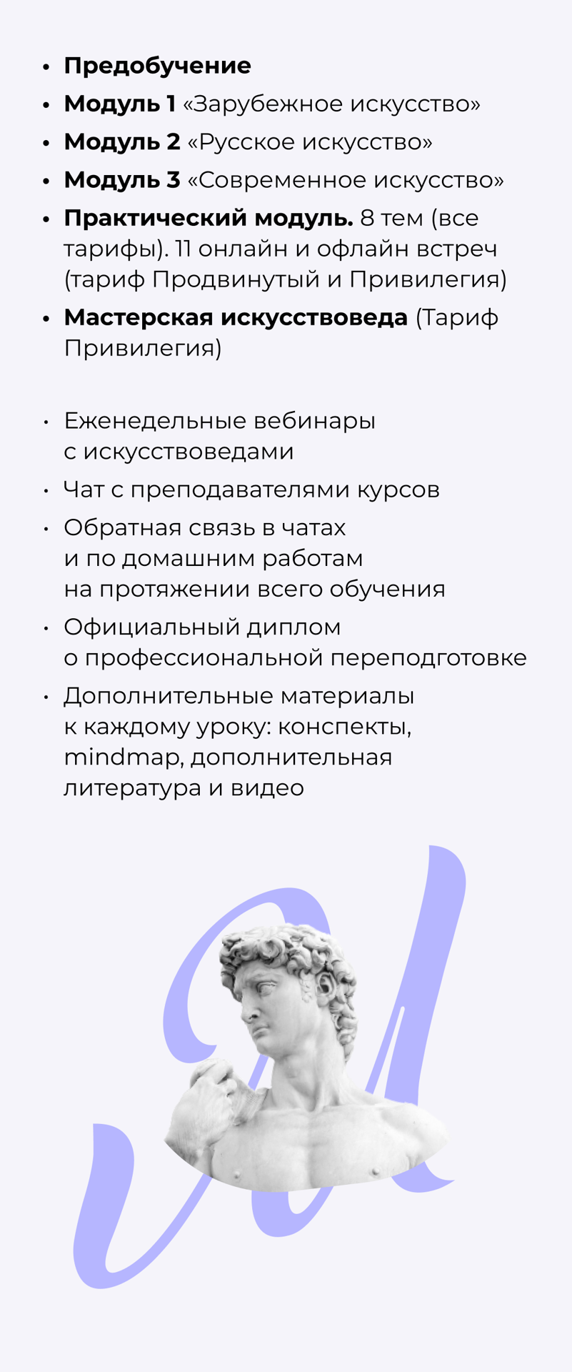 Практический модуль идет параллельно основному лекционному курсу и направлен на отработку практических навыков анализа произведений искусства. Каждый месяц вам будет открываться новая тема, внутри которой: лекция, тест и домашнее задание на отработку полученных навыков (у всех тарифов) + один онлайн семинар (тарифы Продвинутый и Привилегия).