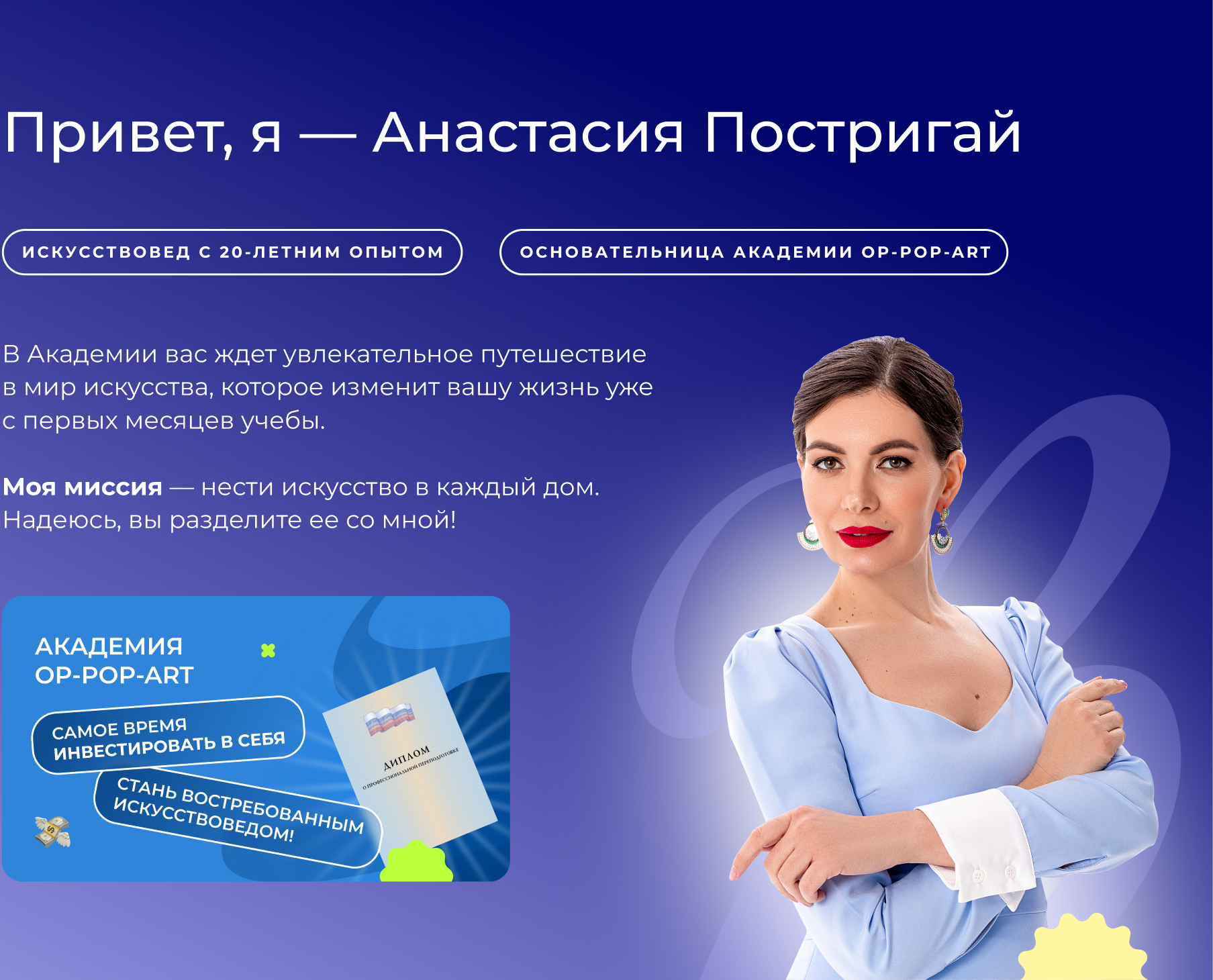 Анастасия Постригай получила образование в РГГУ, специализация — «Мультимедиа в сфере искусства». Дополнительное образование — институт при аукционном доме «Гелос» по специализации «Оценка и экспертиза предметов антиквариата» (красный диплом). Анастасия — искусствовед с 20-летним опытом, основатель Школы Популярного Искусства OP-POP-ART, автор четырех книг по истории искусства. Преподаватели Академии — педагоги из РГГУ, НИУ ВШЭ и других известных вузов.