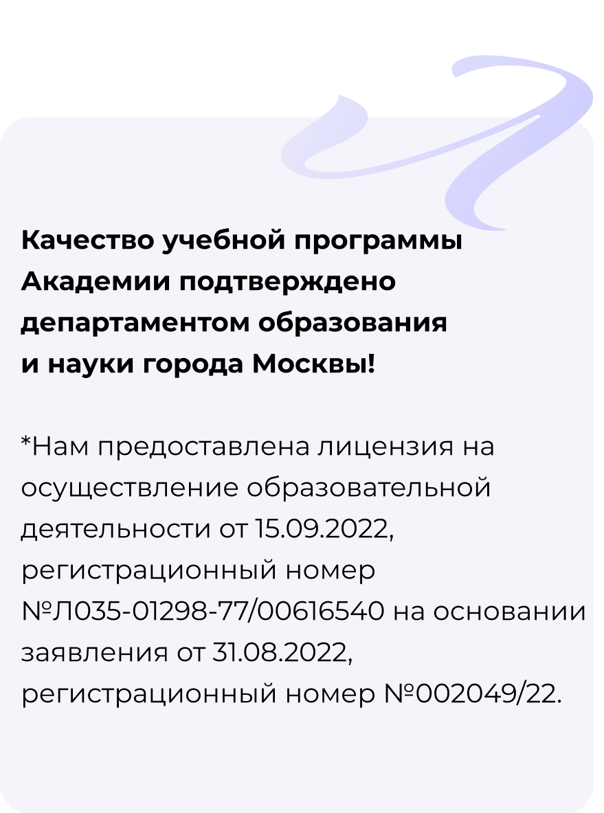 *Нам предоставлена лицензия на осуществление образовательной деятельности от 15.09.2022, регистрационный номер №Л035-01298-77/00616540 на основании заявления от 31.08.2022, регистрационный номер №002049/22.